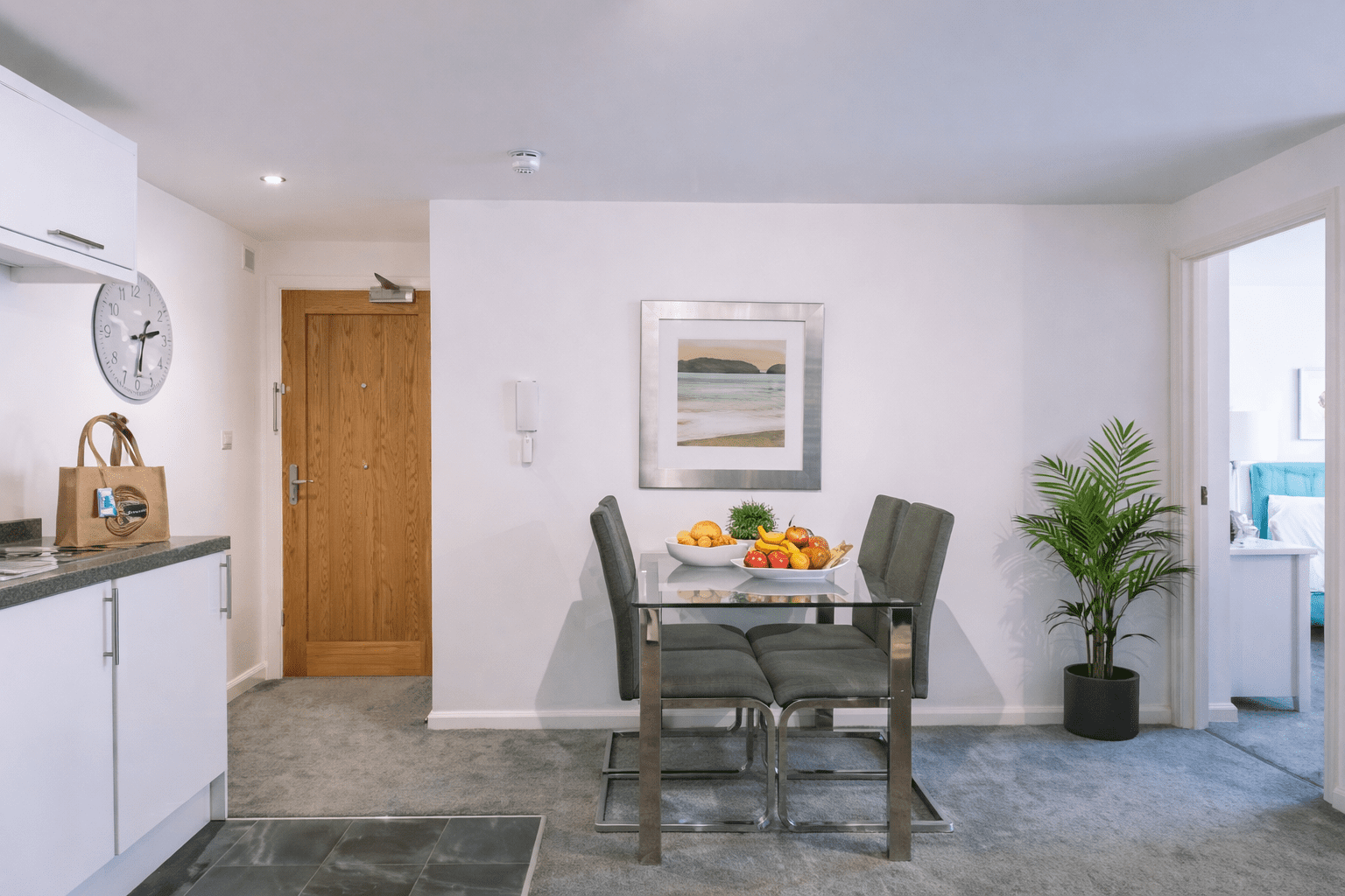 The sleek galley kitchen is fully equipped for everything from morning coffee moments to evening wine and dine, with a modern dining space for four. Two beautifully styled double bedrooms offer calm, hotel-worthy comfort, while the contemporary bathroom with walk-in shower adds a boutique finish.