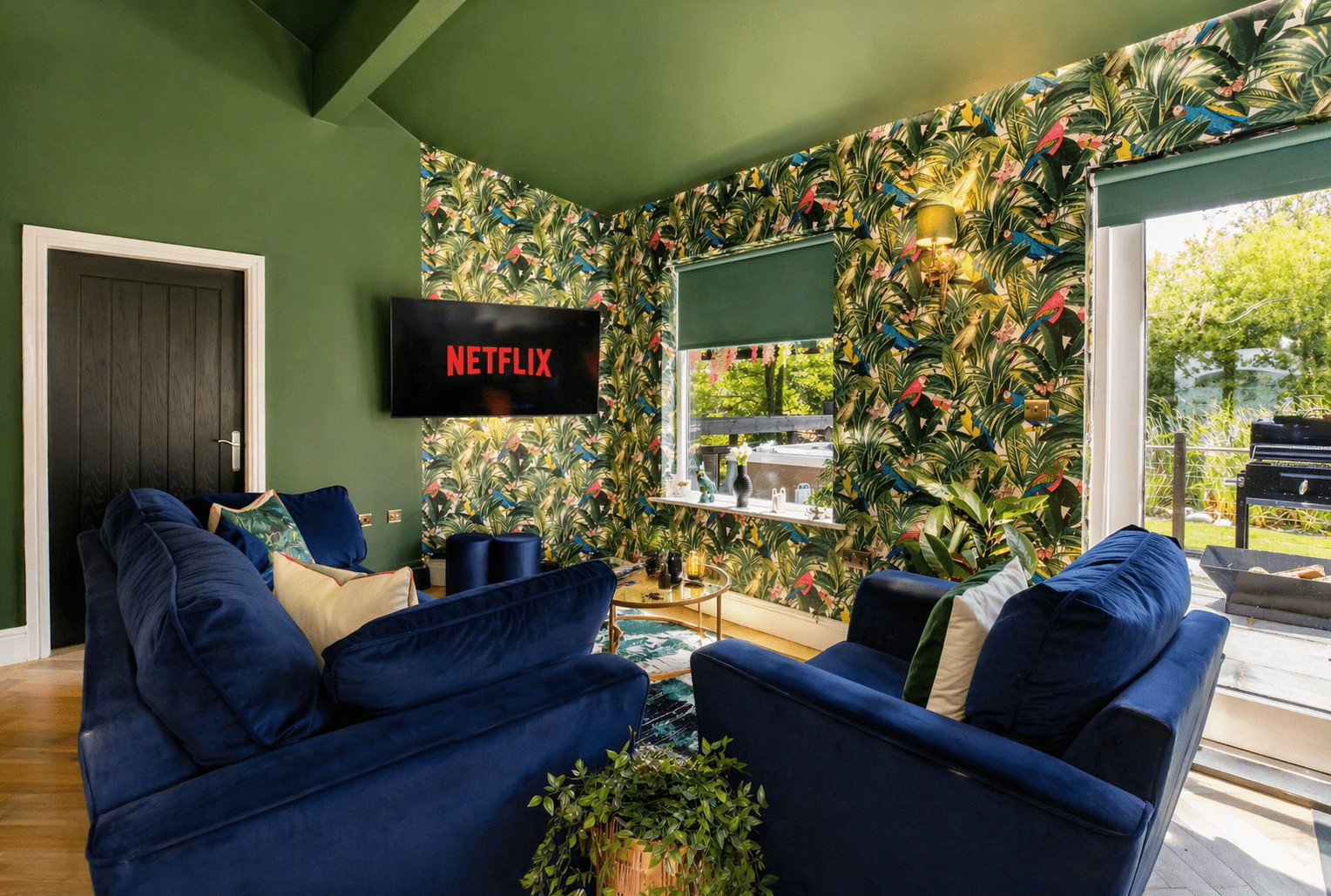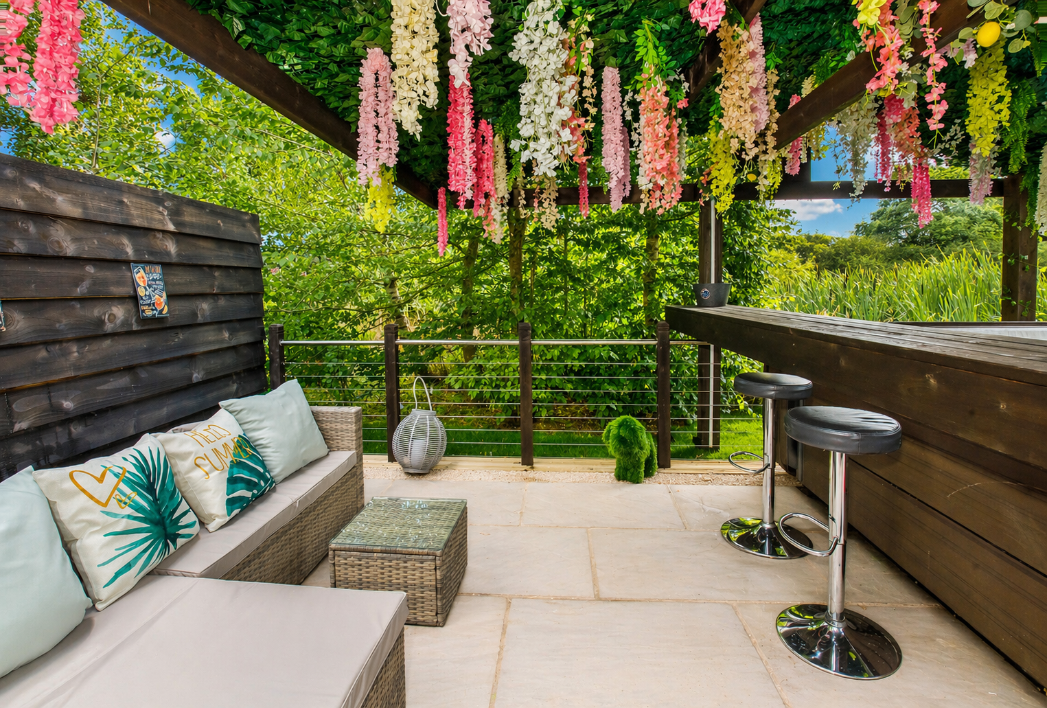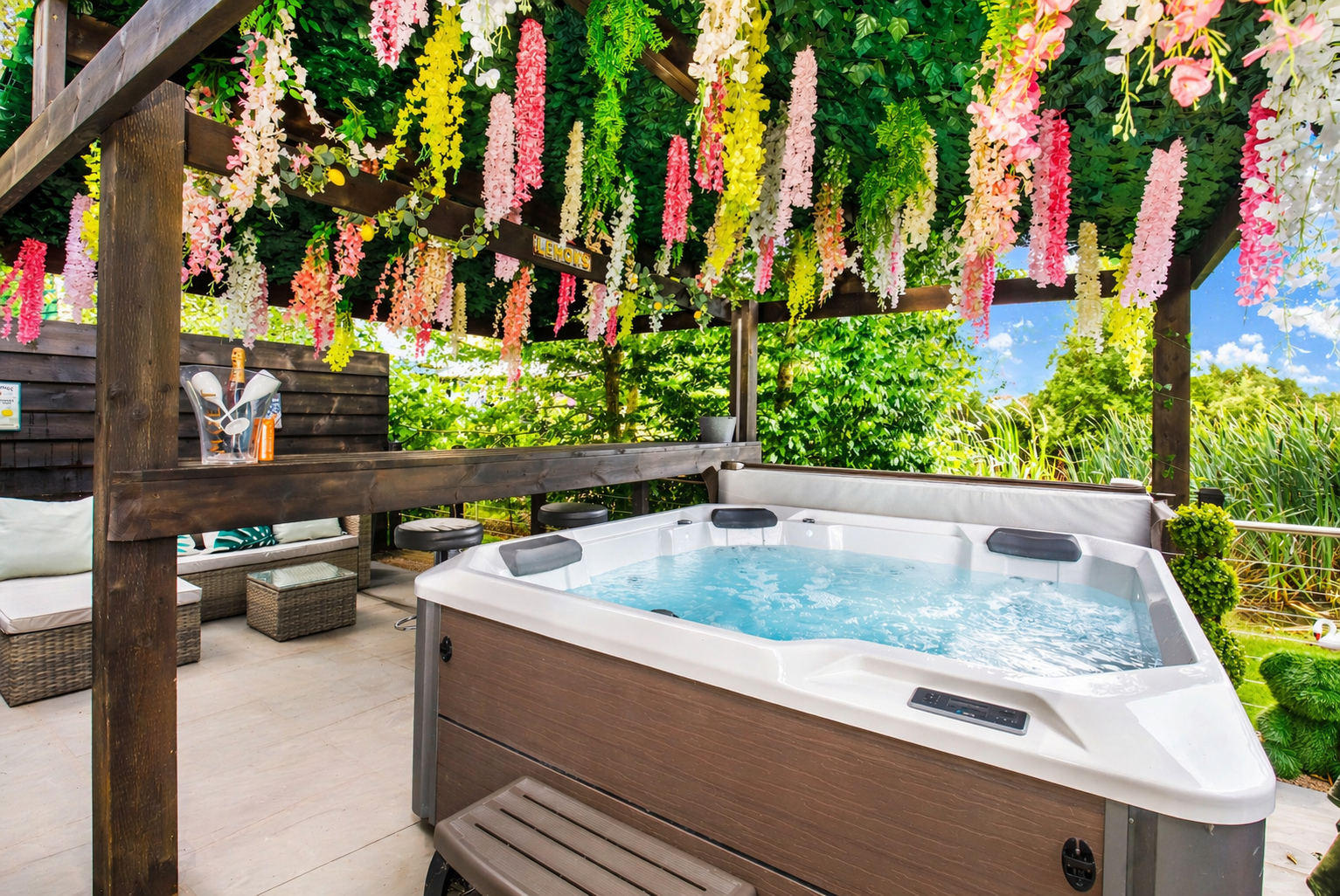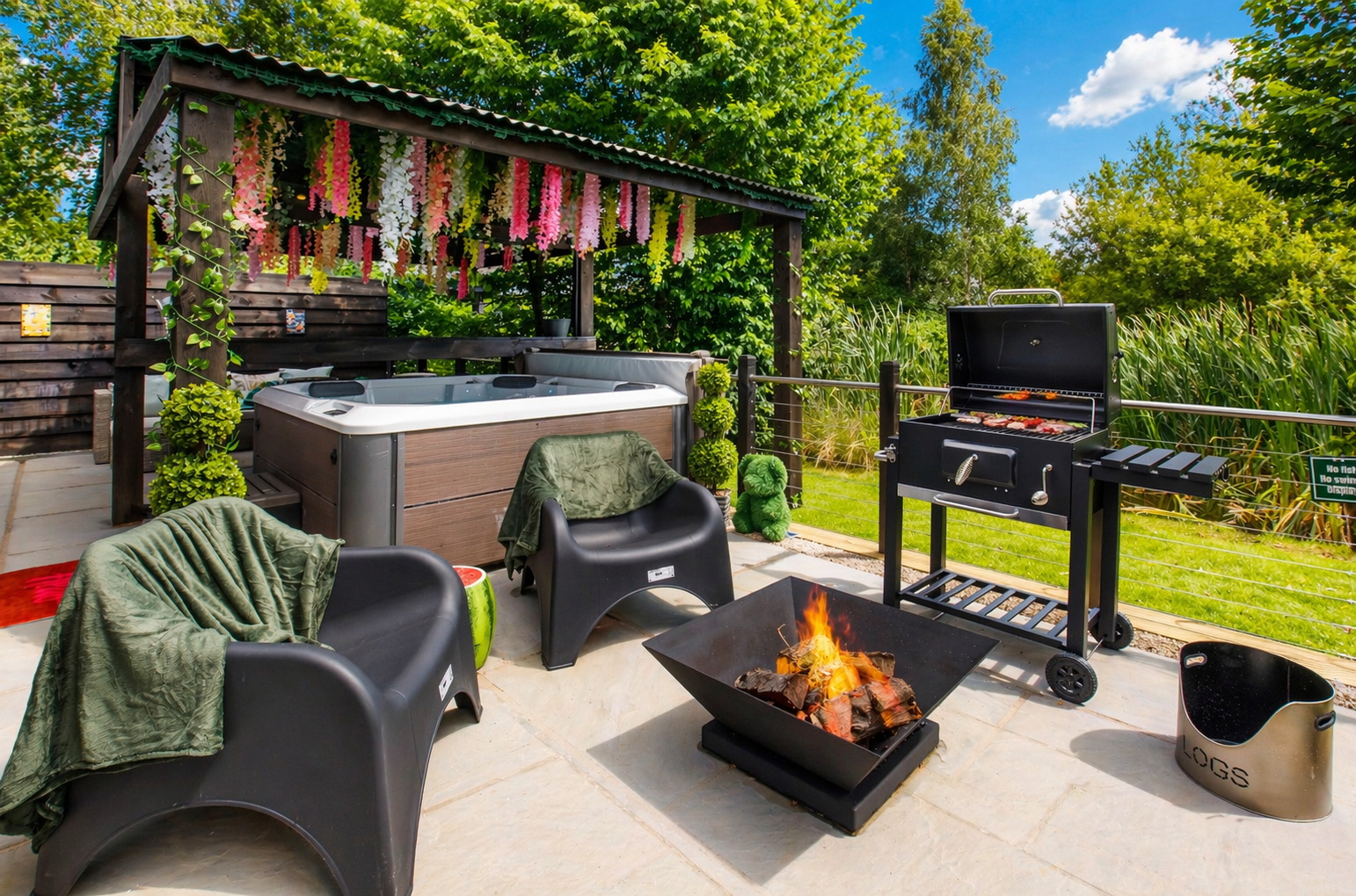 The stunning outside area offers a spacious Patio overlooking the lake. With outdoor seating space for 4 and a luxury 4 seater hot tub with bbq and fire pit.