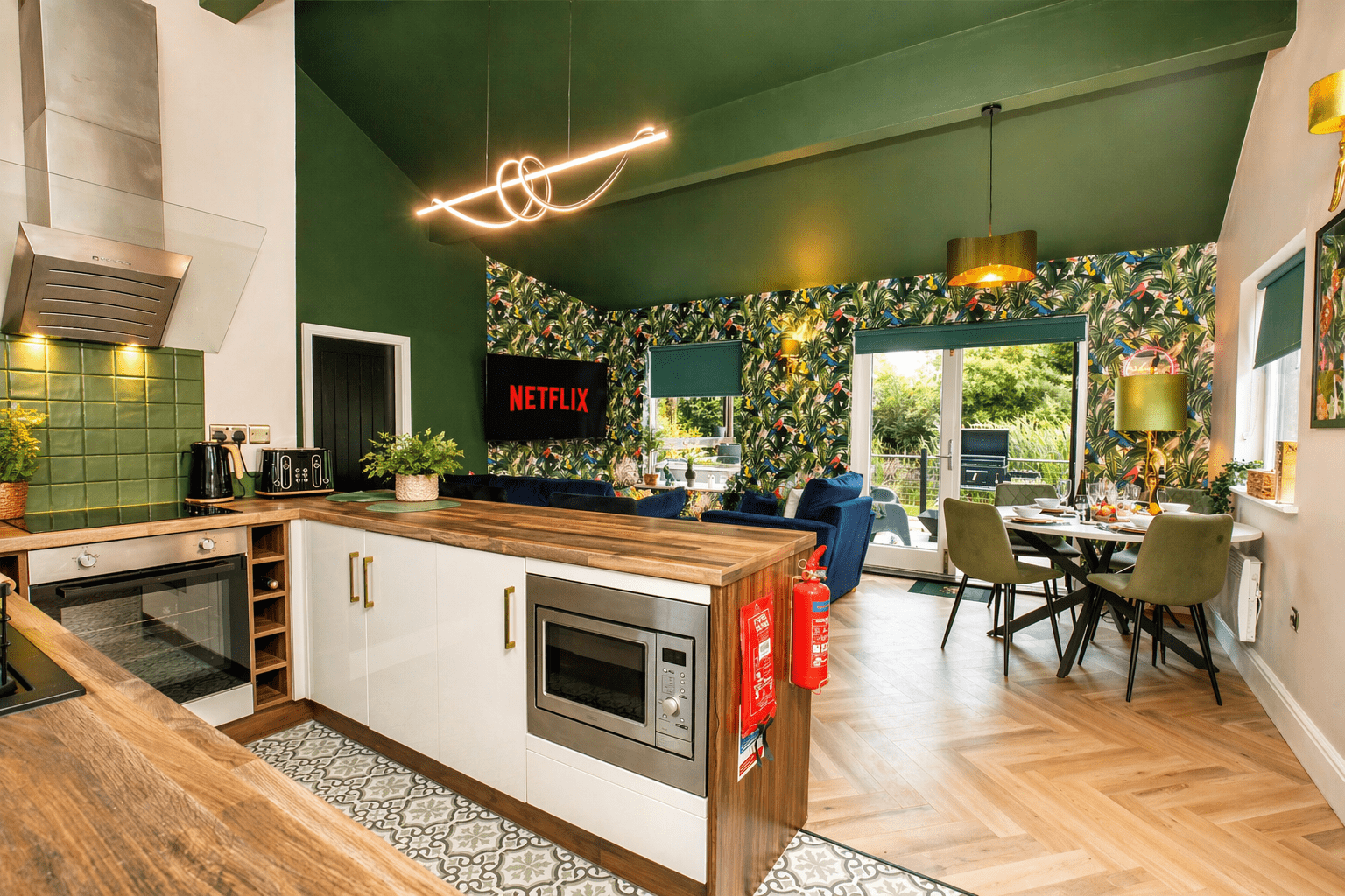 The kitchen area is well equipped for a guest to cook a meal, with all the electrical appliances you should need including a dishwasher, oven and hob, kettle and toaster, air fryer and coffee machine.