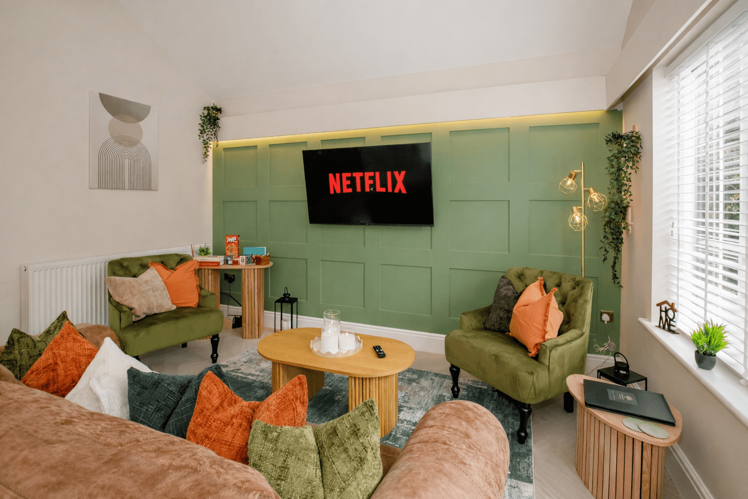The living space provides a comfortable sofa overlooking the Smart Tv and modern features.