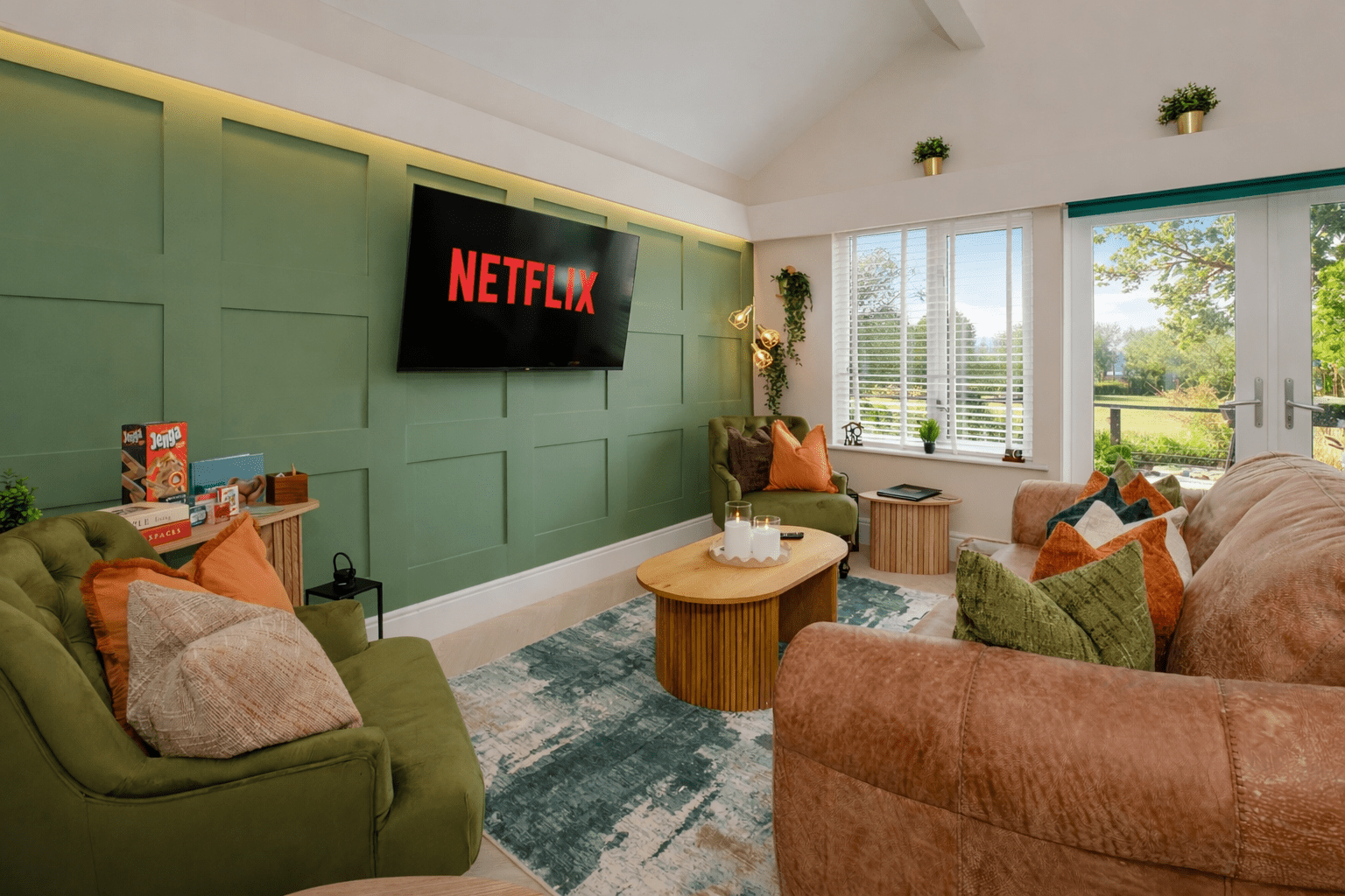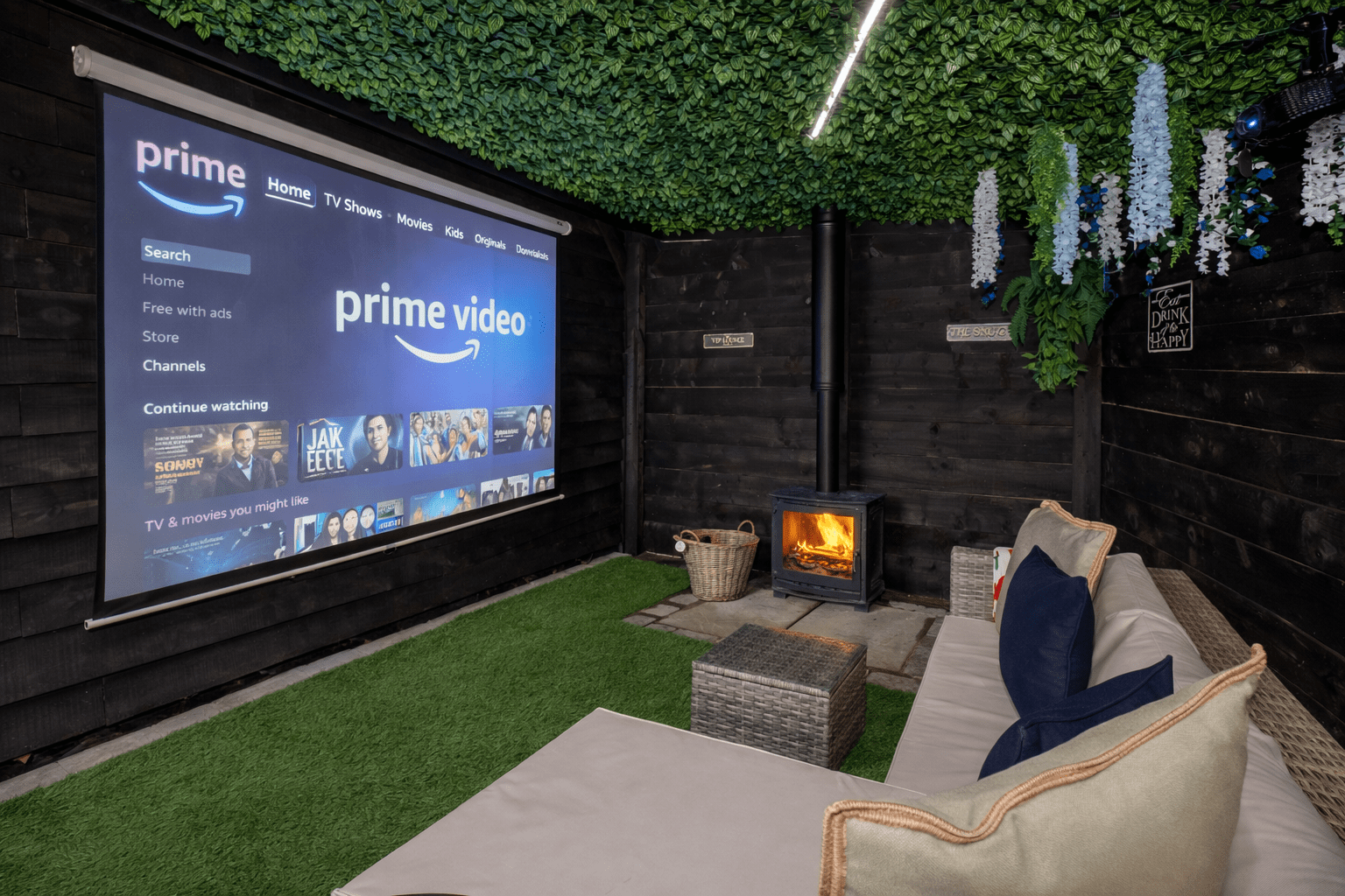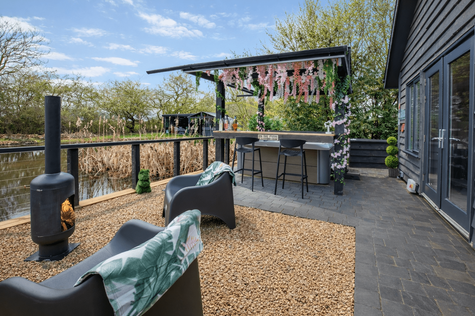 The stunning outside area offers a spacious patio area, overlooking the lake. With a luxury 4 seater hot tub, fire pit, tub chairs and your own private cinema room with a log burner