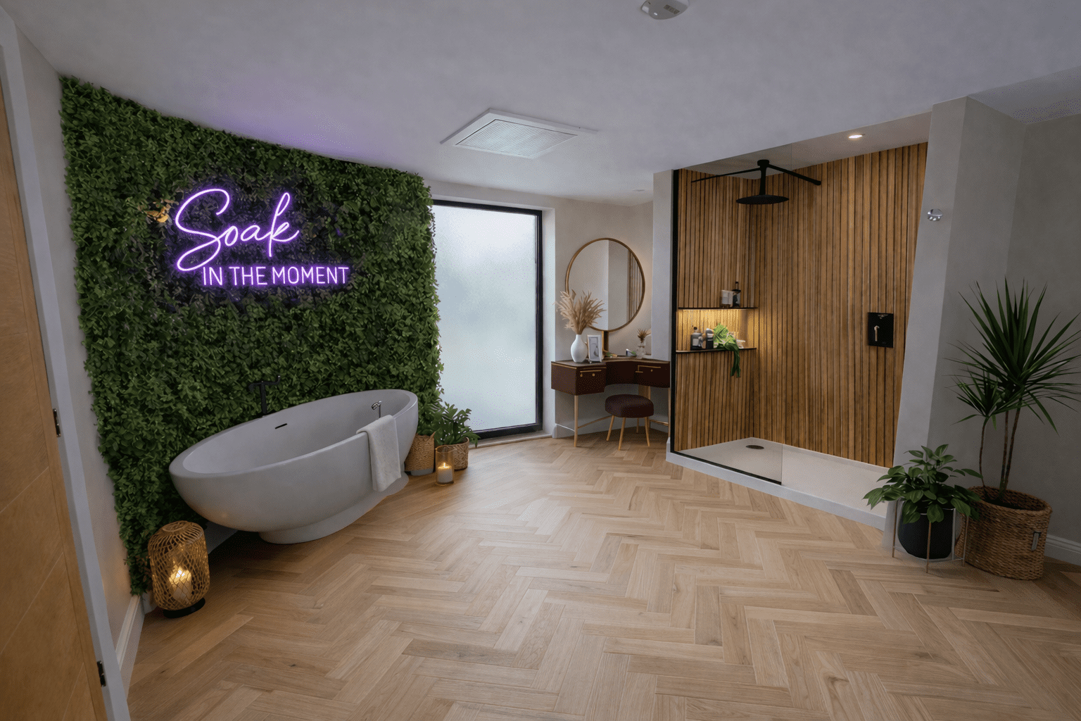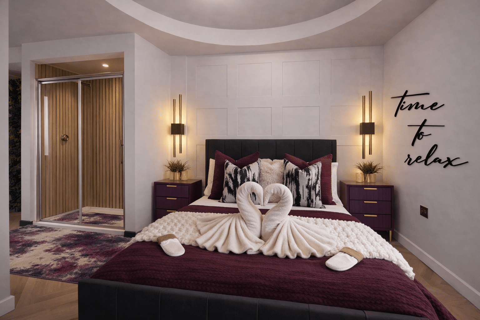 Perfect for two guests, this beautifully designed one-bedroom lodge features a sumptuous king-size bed and a stunning open-plan living space where you can truly unwind. The lodge blends modern style with cosy touches, including a log burner for relaxing evenings and a unique freestanding bath complete with a striking neon feature sign—perfect for soaking in the moment.