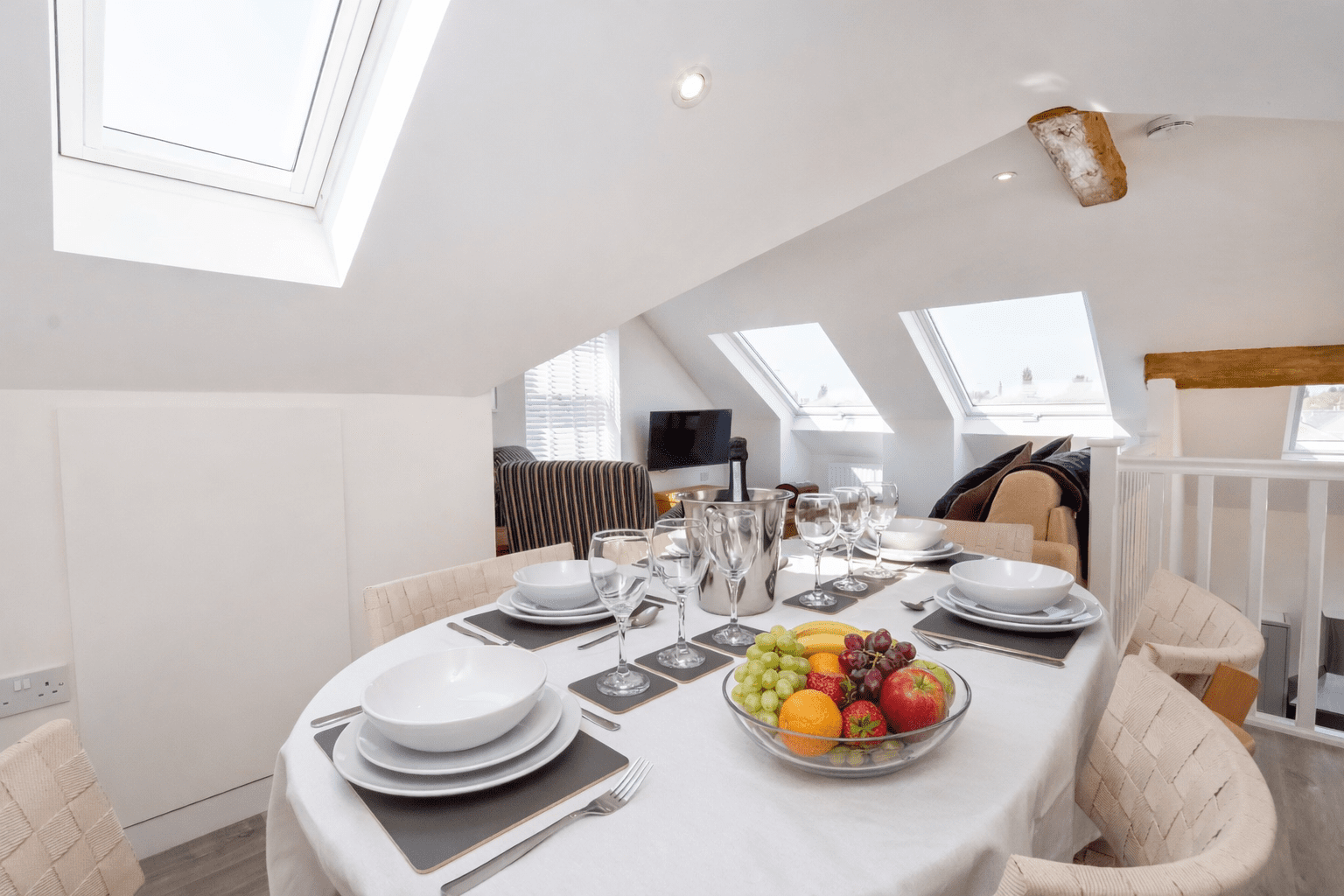 Up the stairs off the kitchen the living room is decorated to a high standard, offering a double sofa bed for extra sleeping space, 2 comfy arm chairs and a smart flat screen Tv to sit and enjoy movie nights. There is a dining table to seat 6 and enjoy a meal together.