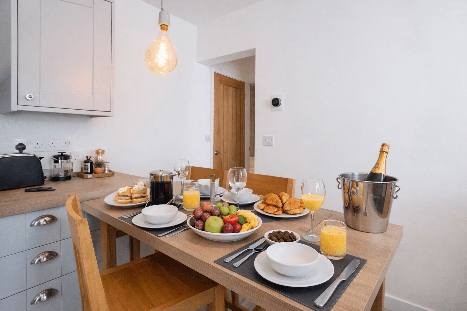 The stylish kitchen comes complete with an electric hob and oven, microwave, kettle, toaster, dishwasher and a washer for your use. Alongside all of the cutlery and crockery you could need to make a basic meal.